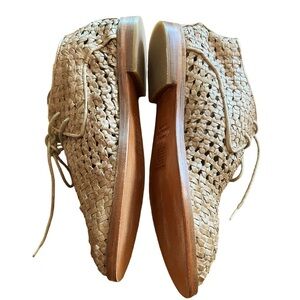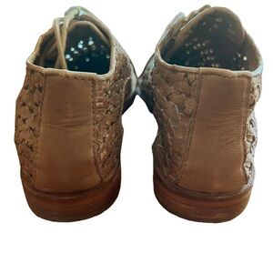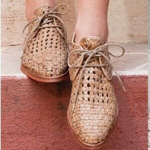 Vintage Foundry Co. Minstrel Womens Fashion Derby in Taupe/Khaki Size 8.5, round toe, not lined, woven leather, stacked 3/4” heel, tribute to vintage pieces of the past. EUC worn once inside.