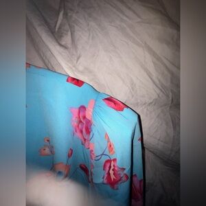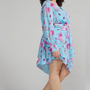 Step into elegance with this Fashion to Figure dress, perfect for a wedding guest or cocktail event. The blue with pink flowers wrap-style dress features a flattering asymmetrical hemline and a sophisticated V-neckline. Long bishop sleeves add a touch of drama, making it a standout choice for any night out.