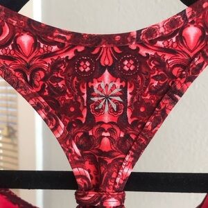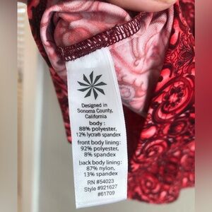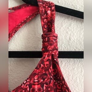 Gorgeous red damask paisley print. Knot detail at shoulder straps and racer back.
