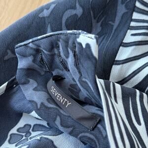 Striking black and white vintage dress handpicked in Italy, featuring a bold abstract butterfly print and structured high neck. Fitted silhouette with subtle puff sleeves, velvet waistband detail, and button closure at the neck and zipper side closure. Elegant and mod with a 70s-inspired edge.