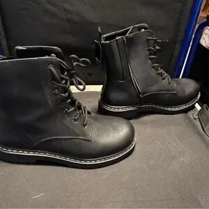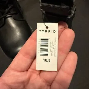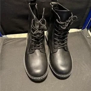 These Torrid black combat boots feature a classic lace-up design with a smooth leather upper and a durable, thick sole. The rounded toe and neat stitching add to their military-inspired style, making them a reliable choice for any adventure. NWT