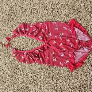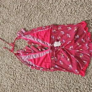 Brand new with tags HAH bodysuit. Sold out at Free People and Revolve. Flirty in a vintage-inspired floral print, this stunning bodysuit from HAH is featured in a halter silhouette with plunging, ruffle-adorned neckline and semi-sheer mesh paneling for added dimension. Features contrast border trimming, tie-front closure, open back, and full coverage bottom with ruffle trim. Print is called "Cheap Perfume Wino" and features beautiful floral detail. Women's size large. Has elastic along top in back and stretch throughout. 100% nylon body & 100 organic cotton lining. Smoke free and pet free home. Please check out my other items...I'd love to make a discounted bundle for you. Thank you!!