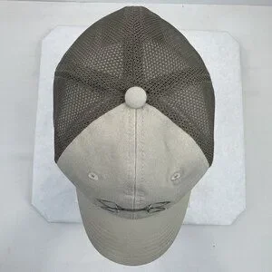 This trucker hat offers a professional appearance with its beige and tan tones, featuring breathable mesh and an adjustable strap, ensuring comfort and a secure fit for various head sizes.