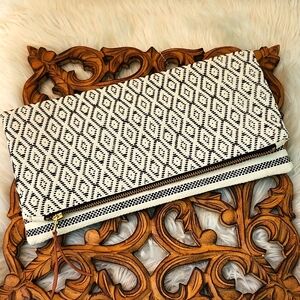NWOT A sleek geometric woven textile is found on this Tribe Alive foldover clutch in black and white. It has a zipper closure with a brown leather zip pull. The interior is completely open and is lined in a natural cotton canvas. This can give two looks with the ability to be folded two ways. It measures 11" X 6" when folded and is in new unused condition. A wonderful chic casual clutch to complement your warm weather attire! Thanks for looking!