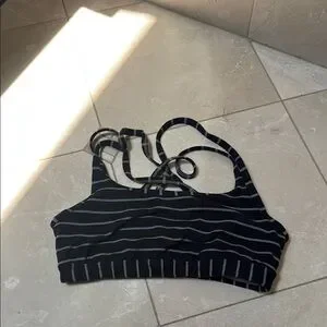 Stylish black and gray striped sports bra. Perfect for workouts.
