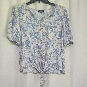 Angels Blue and White Tie Front Short Sleeve Blouse