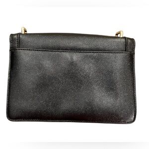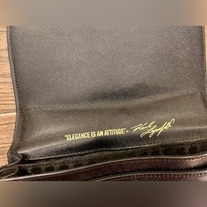 This crossbody bag by Karl Lagerfeld has a sleek black design adorned with striking silver and gold studs. The structured rectangular shape and detachable NWT branded strap add versatility and style, making it a perfect accessory for any occasion.