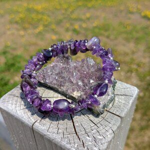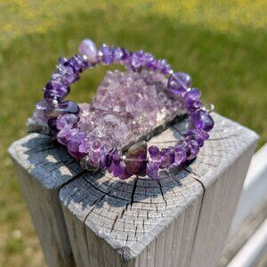 Handmade memory wire bracelet made entirely of genuine, natural purple amethyst. These transparent crystal stones display a range of light to deep purple hues, and are in a variety of shapes and sizes. The silver memory wire running through is steel. This bracelet wraps gently but securely around any size wrist, and will move freely up and down (but not slip over the hand) on smaller wrists.