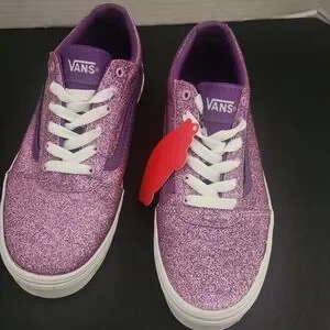 These Vans sneakers boast a striking purple glitter finish that adds a touch of sparkle to your step. The low-top design is paired with contrasting white laces and a sturdy waffle outsole, ensuring both style and comfort for everyday wear.