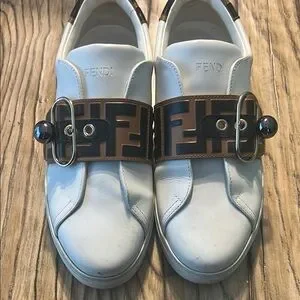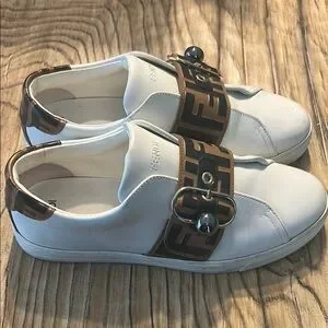 Experience luxury with Fendi's white and brown sneakers, featuring a sleek leather design and iconic monogram straps. These low-top sneakers offer a minimalist aesthetic with a touch of elegance, perfect for elevating your casual style.