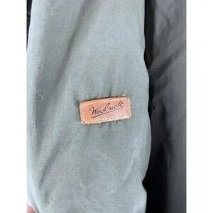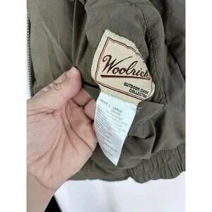 Stay warm and stylish with this Woolrich MG3 Bomber Jacket. The jacket features a green camouflage pattern with a stand-up collar and front field pockets. It is made of polyester outer shell material with a nylon lining and accented with Woolrich branding. The jacket is reversible, windproof, and waterproof, making it perfect for hunting, shooting, and outdoor activities. It has a full zip and snap closure and is machine washable for easy care. The jacket is available in size L and is ideal for casual wear and workwear.