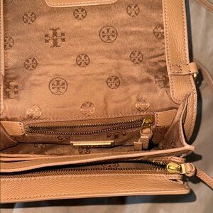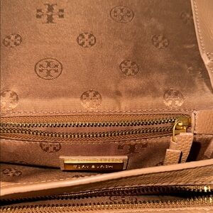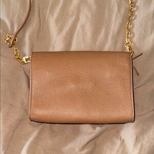 This sophisticated crossbody bag by Tory Burch combines a tan leather finish with gold accents, offering a timeless and versatile accessory. The structured design and gold chain strap add a touch of elegance, making it perfect for any occasion.