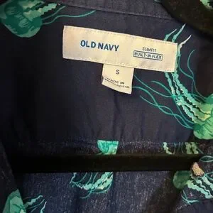 Embrace a playful nautical vibe with this Old Navy shirt, showcasing a vibrant jellyfish print on a navy blue base. Ideal for warm weather, this casual button-down offers a unique blend of style and comfort.