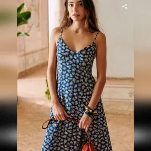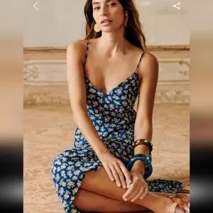 Sezane Marguarita Blue Floral Midi Sleeveless Dress