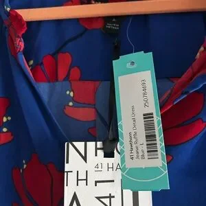 Embrace the vibrant charm of this 41 Hawthorn sundress, featuring a striking cowl neckline and a sleeveless design perfect for resort wear. The mini dress showcases a captivating blend of red and blue, making it an ideal choice for casual outings. Its lightweight fabric ensures comfort and style in warm weather.