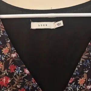 This elegant black blouse by Lush features flutter sleeves and a chic tie front, adding a touch of sophistication to any outfit. The 3/4 sleeve length and ruffled details create a stylish and modern look, perfect for both casual and formal occasions. Its crop style offers a trendy silhouette, making it a versatile addition to your wardrobe.