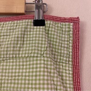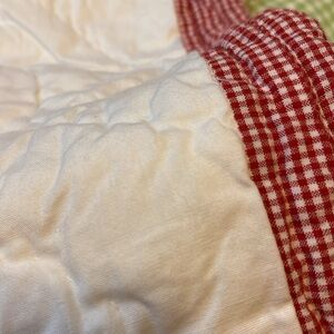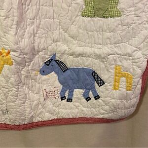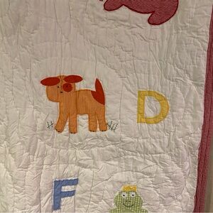 Rare and hard to find! Very good used condition. One small yellow stain near the D. No other flaws. Pottery Barn Kids crib/baby quilt in Alphabet Soup. A white quilt with an alligator, bunny, chicken, dog, elephant, frog prince, giraffe, and horse applique of gingham embroidered fabric. Red gingham border. Green gingham back with sleeve for hanging on the wall! Ends still sewn shut. Approximately 36" x 50". Long tag has been removed. 100% cotton. Machine wash. No trades, please!