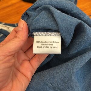Po-em Handloom Blouse Tank in Hoja print. Size XS. Blue and white hand blocked pattern cotton. Sold out in this pattern! We love that the Tank Blouse Top in Relic has a wider shoulder so its not quite a tank, and with the slight crop it's feminine and fun to wear. Our favorite part is the open side seams (about 6" on each side) adding that special charm. In good gently worn condition. Slightly frayed at the v-neck seam. Last photo to show fit.