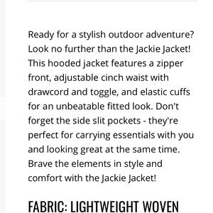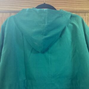 You’ll love the Jackie jacket from LuLaRoe! This beautiful green jacket features a zipper front, cinch waist, a hood, elastic sleeves and side slit pockets. Unbelievably lightweight, but keeps you warm during brisk spring and summer weather. Soft fabric too!