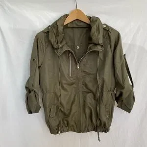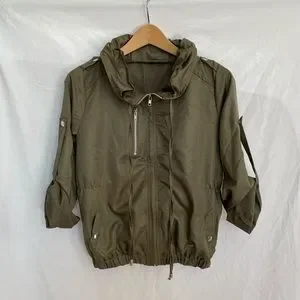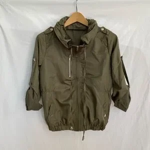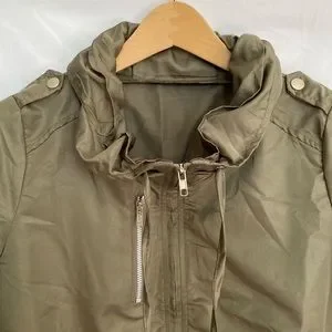 Olive Green, zipper accent on chest (not an actual pocket), two pockets, two button tablets on sleeves for rolling up, two drawstrings for cinching collar, collar can stand up or be folded down, elasticized hem, cinched at sides of waist.