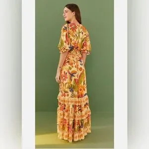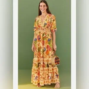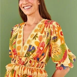 Step into resort-ready elegance with this FARM Rio sundress, featuring a vibrant yellow and gold palette. The dress boasts a charming v-neckline, puff short sleeves, and a ruffled, tiered skirt that flows gracefully. Perfect for a sunny getaway, its light fabric and cheerful design make it a standout choice for any resort occasion.