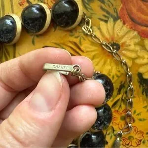 Vintage 1950s Charel necklace. Black glasslike beads appear speckled but when you turn them to the side they’re clear — like magic! They’re each set in a crescent moon shaped metal, making for a very gothic and whimsical (whimsigoth!) appearance.