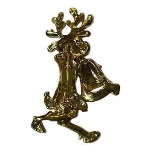 Charming gold reindeer brooch featuring red antlers and green accents. Perfect for holiday wear.
