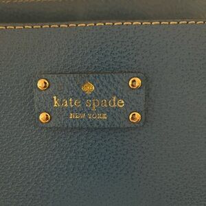 "Omega Blue" Leather Tote Handbag~Clean and classic, this spacious leather tote features a trio of interior compartments to keep essentials organized ~ roll handles ensure comfortable carry~leather~beige and gold custom polka dot fabric lining~ middle zip compartment~two large slide pockets~large zippered compartment with Kate spade leather logo plate~gold plated feet on bottom ~16"w x 13"h x 6"d~strap drop 8"~stored away