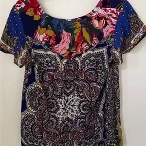 Anthropologie Moulinette Soeurs Boho Floral Multicolor Scarf Top featuring flutter sleeves. Women’s US Size 8. 100% Viscose. Excellent condition.