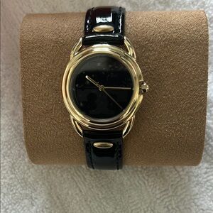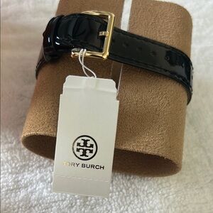 Stylish watch with a sleek black strap and gold-tone case. Includes signature orange box and warranty / care instructions. Brand new in box with tags. Plastic protective sticker still on watch face.