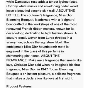 Christian Dior Miss Dior Blooming Bouquet 150ml (5 ounces) only sprayed once. Purchased 2 years ago from Dior online store for $178. Still smells great. (I reserve the right to cancel any orders from buyers with little or no prior activity to protect myself.) A line will be drawn through the bar code before shipped to prevent item from being returned to Dior.)
