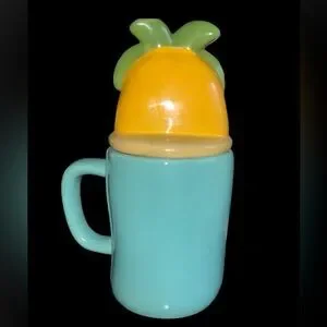 Enjoy your favorite beverage with this tropical-themed Rae Dunn mug featuring a vibrant palm tree design. The blue mug and yellow lid add a splash of color to your dining experience. Perfect for beach lovers.