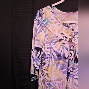 This Southern Lady blouse showcases a beautiful cream and white base with an artistic leaf design, offering a blend of elegance and casual style. The flowing pattern adds depth and sophistication, making it a versatile addition to any wardrobe.