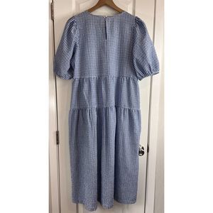 Charming blue gingham midi dress. Features puff sleeves and tiered design. Perfect for casual outing.