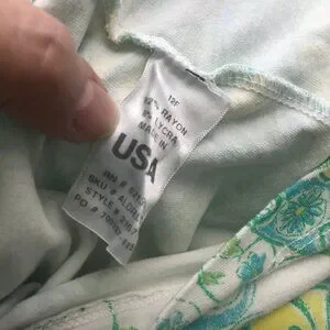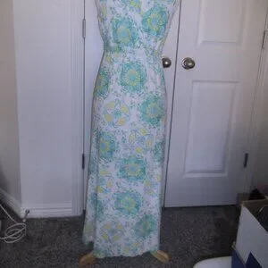 Turquoise and yellow design on a white background. Empire waist has a drawstring tie with wooden accents. 36” chest, 2” shoulder straps, 51” from shoulder to original hem. 92% rayon and 8% lycra. Perfect pre-owned condition. Made in USA. Please check out the other items in my closet. Bundle and save.