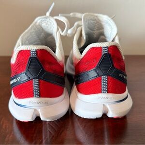 Barely used sneakers featuring USA red, white, and blue theme. This is the Kinvara 12 in USA silhouette. Tongue says USA with “The United States of America” running vertically. Insole is stamped USA.
