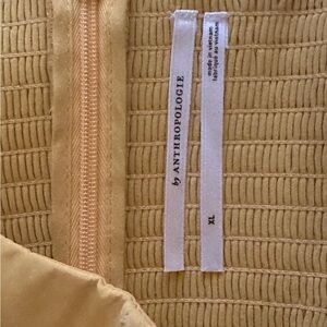 This stunning yellow dress from Anthropologie features a strapless design and a dramatic high-low hemline. The fitted waist and cascading skirt create a flattering silhouette, perfect for special occasions. The fabric's slight sheen adds a touch of elegance to this vibrant piece.