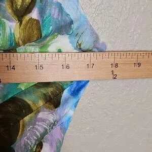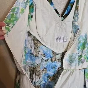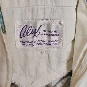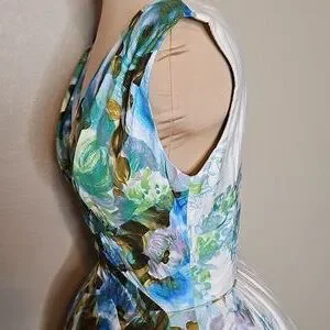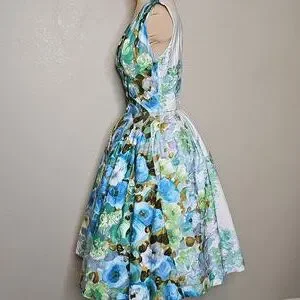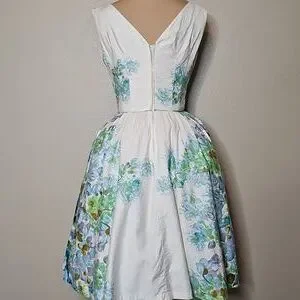 True Vintage Alix Of Miami 1950s Floral Sleeveless Dress Blue and Green in excellent vintage condition except for minor discolorations on lower back of dress, see pics. STUNNING watercolor floral print that fades into to a ivory print at the back, Pieced waistline that perfectly spreads into the bust line. V neck with slightly "almost"? off the shoulder style. Just precious!! See photos for measurements.