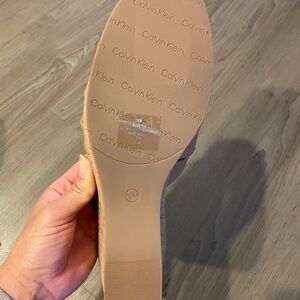 Experience modern elegance with these Calvin Klein wedges, featuring a sophisticated tan color and a unique geometric strap design. The slip-on style and square toe offer a minimalist look, perfect for versatile summer wear. Enjoy the comfort of a low heel, making these mules an ideal choice for any occasion. NWOT, never worn