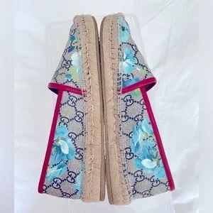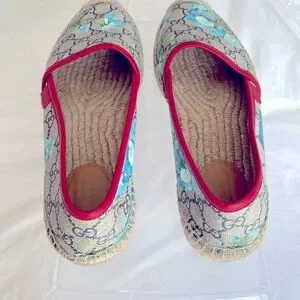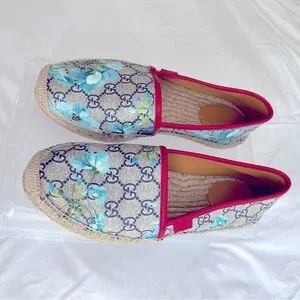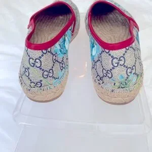 Step out in style with these Gucci Women's Espadrilles, featuring a vibrant floral design. The blue and red colors add a chic touch to any outfit. Perfect for casual outings or a day at the beach.