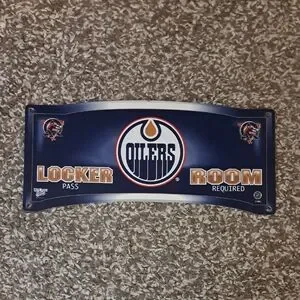 Blue and white Edmonton Oilers locker room sign with team logo. Approximately 18 3/4 by 8 inches Fantastic condition