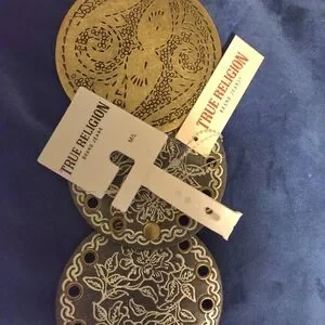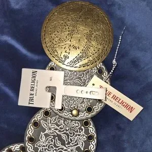 Enhance your ensemble with the True Religion Belt, showcasing exquisite gold and silver tones. This accessory features detailed metalwork, adding a sophisticated touch to any outfit. Ideal for making a statement on any occasion.