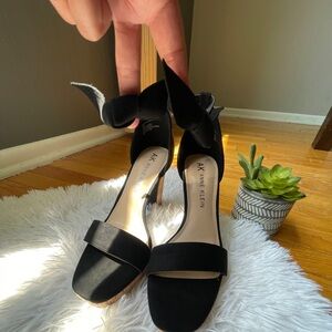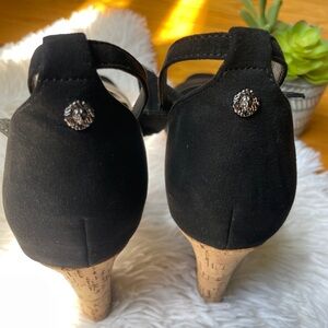 Step out in style with these elegant black platform sandals. Featuring a chic cork heel, these shoes offer both comfort and sophistication. Perfect for any occasion.