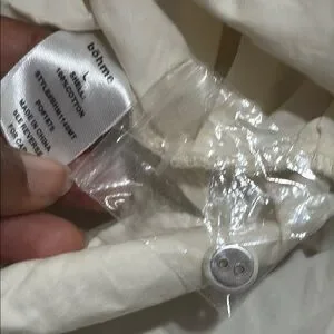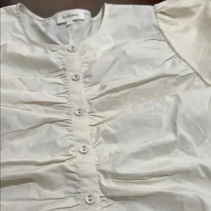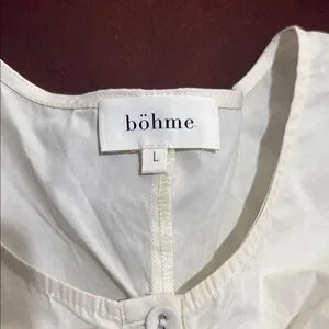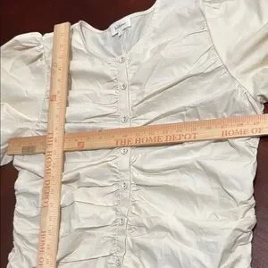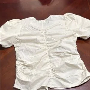 This stylish Bohme blouse from Anthropologie Frankie ruched blouse in natural features a round neck front button and short puff sleeves, crafted in a soft cream hue. The ruched detailing along the front adds a touch of elegance, making it a versatile addition to any wardrobe. New no tags. Coquette.