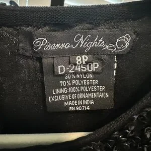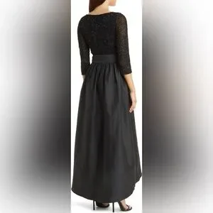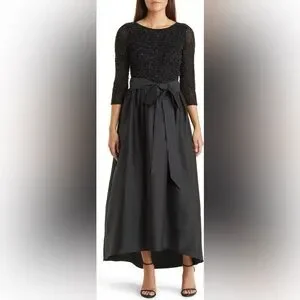 A sparkling beaded-and-sequined tulle bodice tops the voluminous taffeta skirt of this elegant high-low gown with the look of a two-piece ensemble. A removable sash smartly ties the look together.