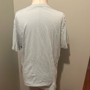 Casual gray graphic T-shirt with a bold front design. Perfect for everyday wear. Small area of white that looks tie dye.