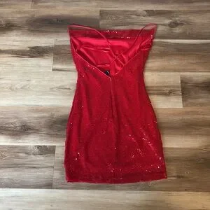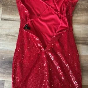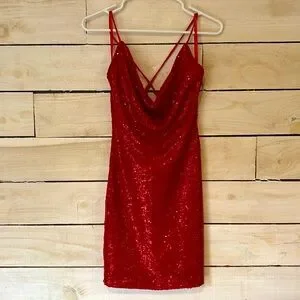 Stunning red mini dress with sequins. Features a deep V-neck and spaghetti straps. Perfect for a night out.