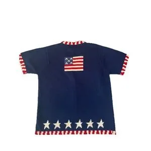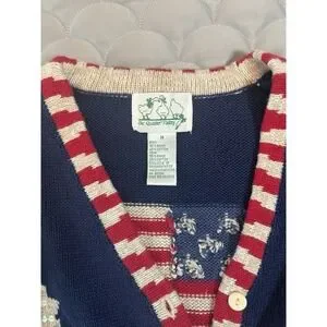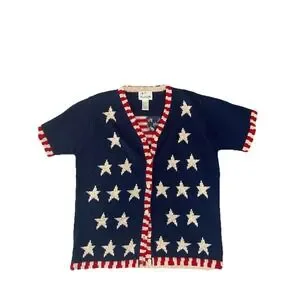 This VTG Quacker Factory Blue Sweater is a patriotic cardigan featuring an American flag stars design, perfect for showing off your patriotic spirit. The tight-knit cotton blend material with a V-neck and button accents give it a classic and stylish look. Perfect for a casual and patriotic outfit, this vintage sweater in size M is a great addition to any woman's wardrobe.