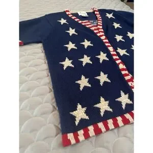VTG Quacker Factory Blue Sweater American Flag Stars Patriotic Cardigan Sz M