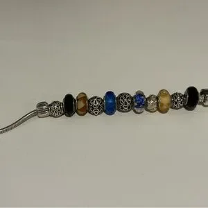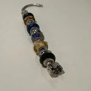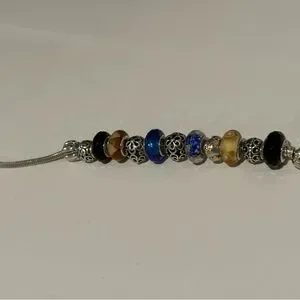 Elegant silver charm bracelet featuring blue and black beads. Perfect for any occasion.